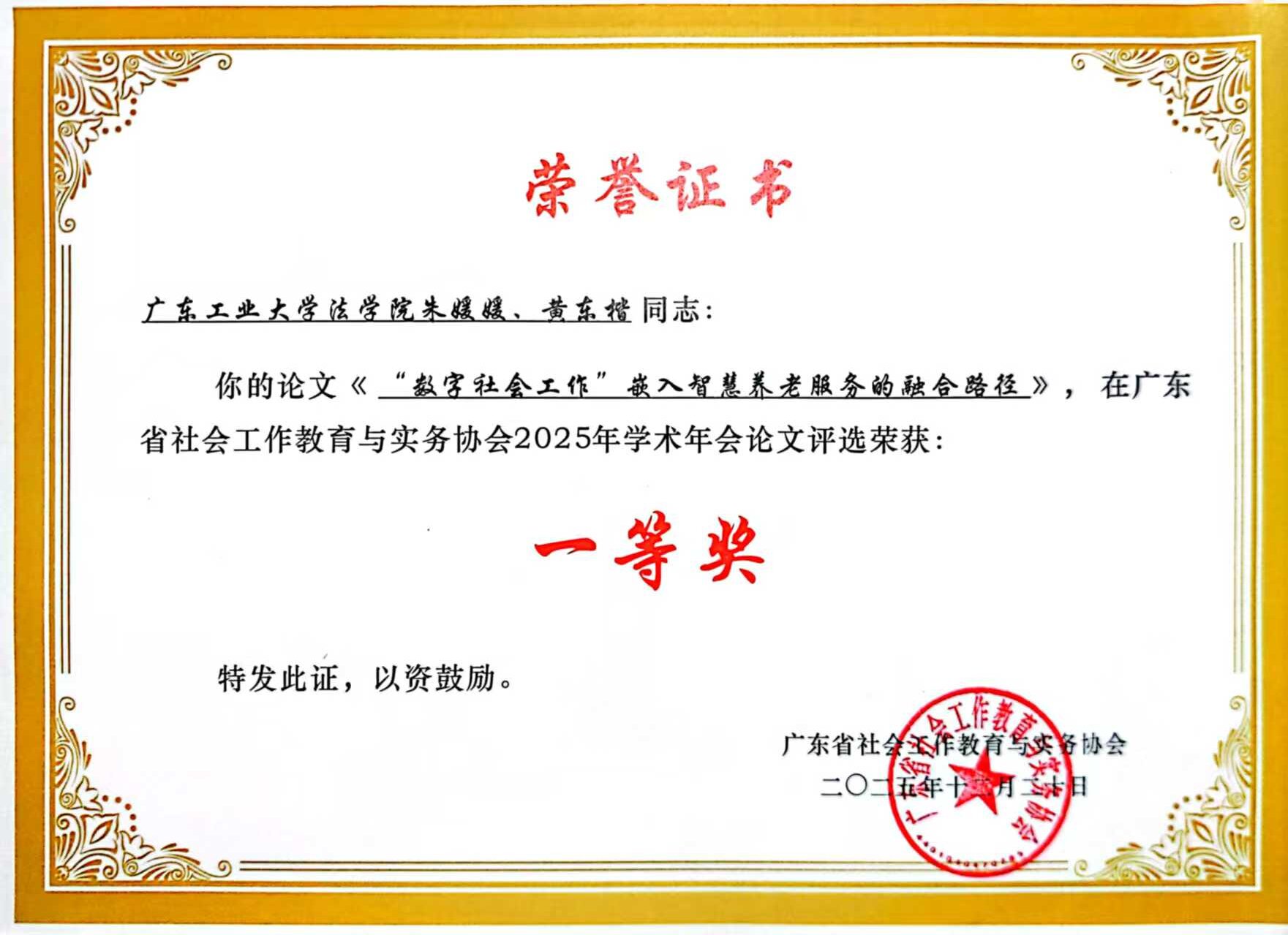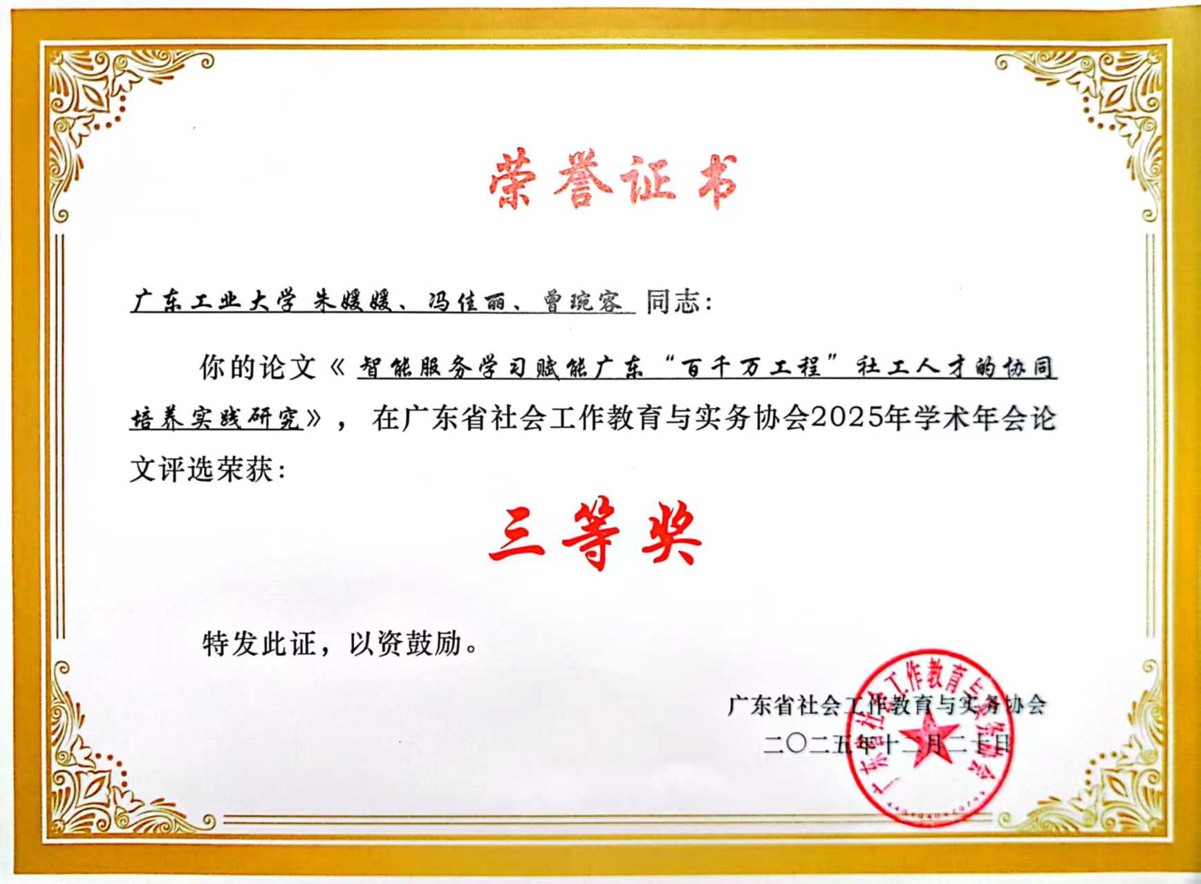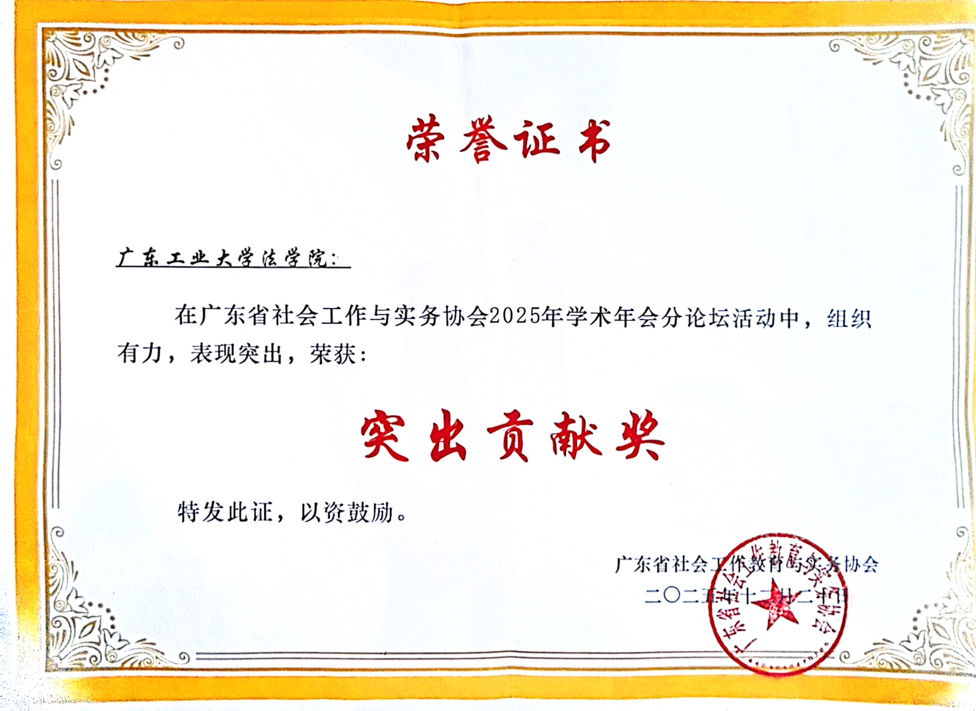 2025年12月19日至21日,以“社工聚力 协同赋能,共绘广东‘百千万工程’新图景”为主题的广东省社会工作教育与实务协会2025学术年会在梅州嘉应学院举办。本次年会由广东省社会工作教育与实务协会主办,嘉应学院法学与公共事务学院承办,广东工业大学法学院社会工作系等37家单位协办。在年会筹备与举办的过程中,我院社会工作系积极统筹、表现突出,在分论坛组织工作中荣获“突出贡献奖”,并被授予“会议协办贡献证书”。