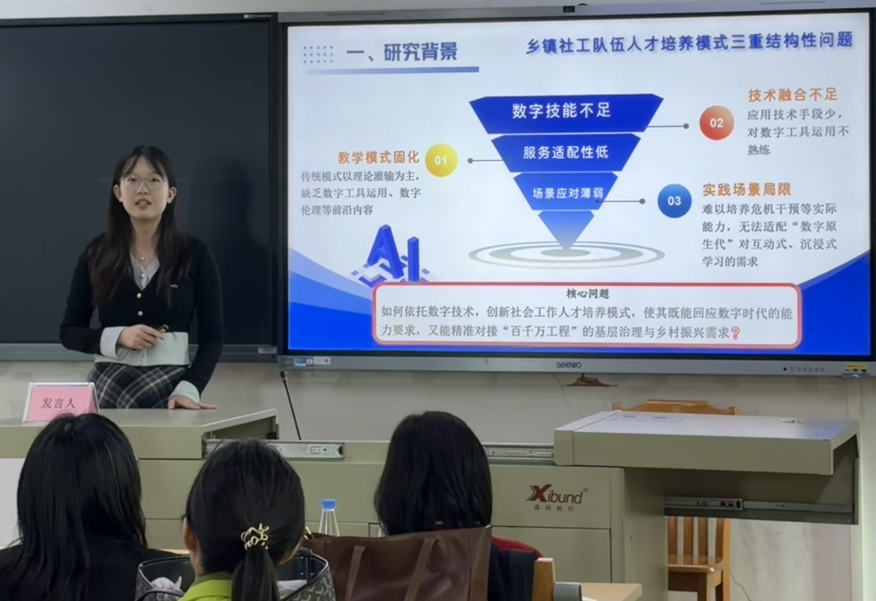 此外,广东工业大学MSW学生代表冯佳丽在第六分论坛“党建引领、家庭、妇女、残疾人、新就业群体等社会工作”中,以《智能服务学习赋能广东“百千万工程”社工人才的协同培养实践研究》为题进行交流,探索社工人才培养与 “百千万工程” 深度对接的有效机制。