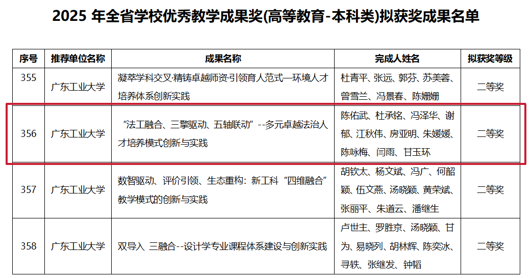 近日,广东省教育厅正式公布2025年全省学校优秀教学成果奖(高等教育-本科类)获奖名单。在我校党委常委、副校长、我院法学学科带头人杜承铭教授的悉心指导与大力支持下,由我院陈佑武院长领衔,冯泽华、谢郁、江秋伟、房亚明、朱媛媛、陈咏梅、闫雨、甘玉环等教师共同完成的教学成果《“法工融合、三擎驱动、五轴联动”——多元卓越法治人才培养模式创新与实践》荣获二等奖,实现我院在该奖项上零的突破。