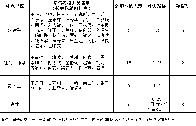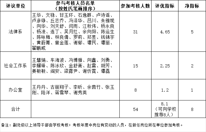 (三)学院按法律系、社会工作系以及办公室分为3个评议单位,各评议单位组成3人评议小组,负责组织教工计算考核分、述职、评议,以及提出初步考核建议等次、评语填写等工作。各评议小组成员名单如下: